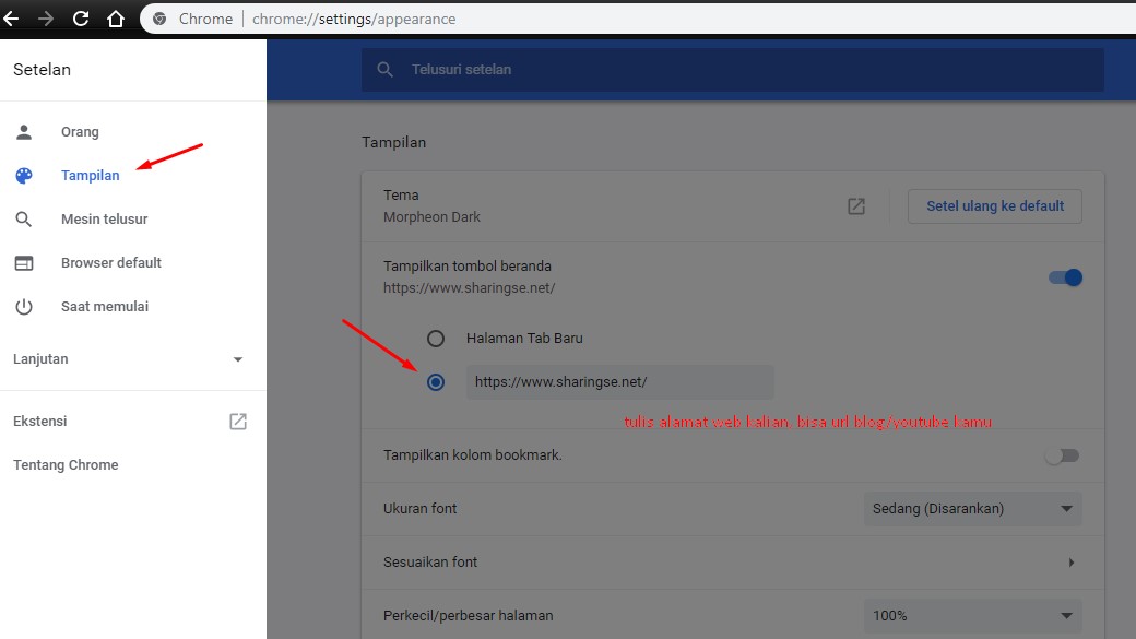- pilih Beranda dan isikan alamat url kamu